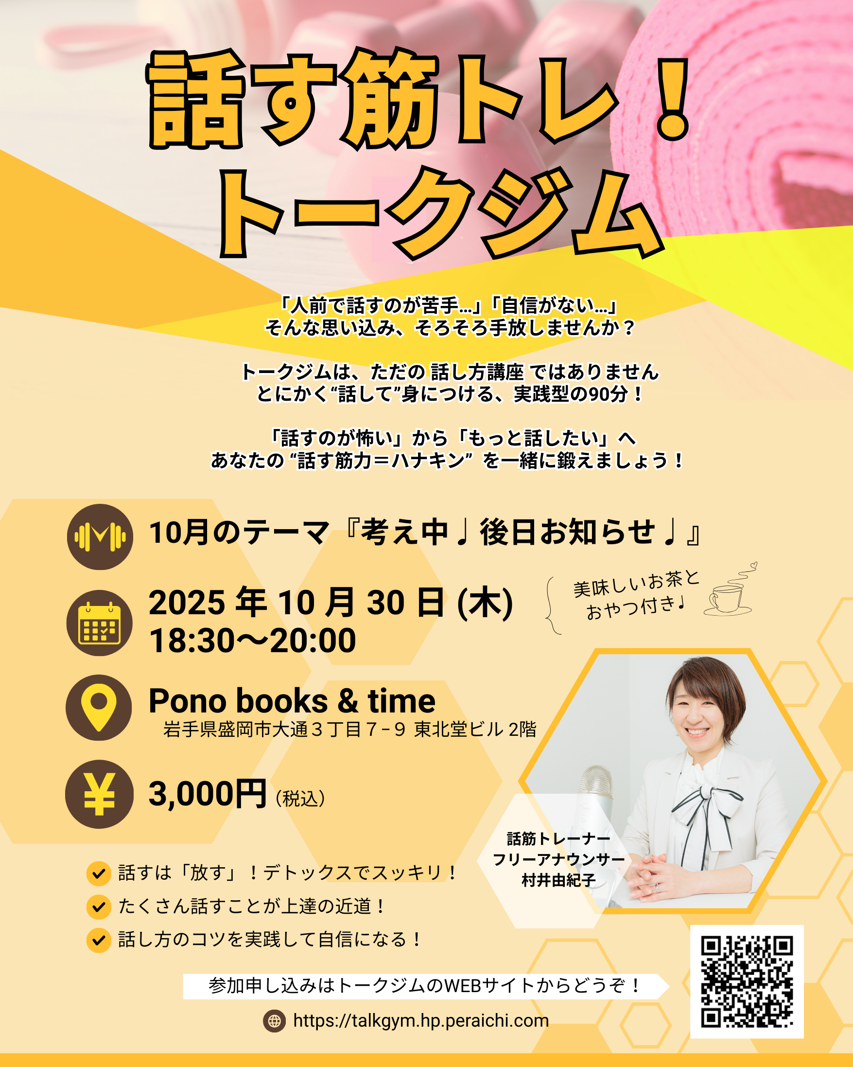 10月のテーマは 「考え中♩後日お知らせ♩」 話し方のコツを実践していただきながら、話す筋肉を刺激し鍛えるプログラムです。 |